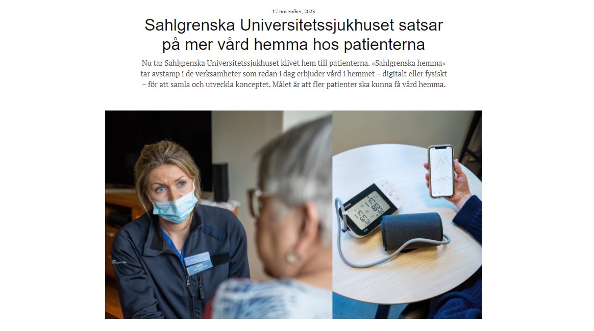 Med Sahlgrenska hemma, som lanserades i november, kopplar vi ett samlat grepp för sjukhusvård i hemmet. Sahlgrenska hemma tar avstamp i de verksamheter som redan idag erbjuder vård i hemmet – digitalt eller fysiskt – för att samla och utveckla konceptet. Målet är att fler patienter ska få vård hemma.