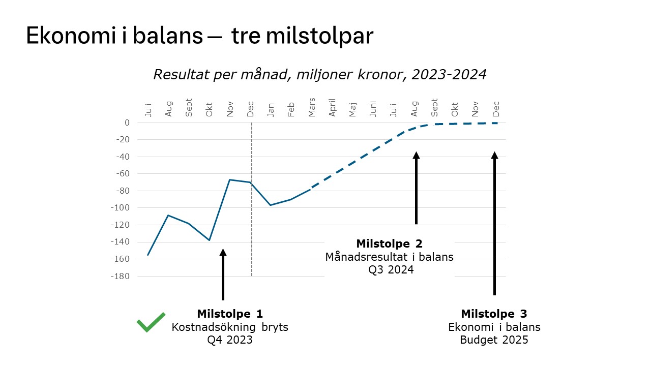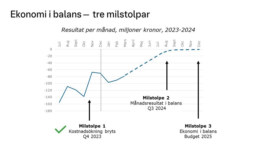 Att vända den ekonomiska utvecklingen var en trovärdighetsfråga för förvaltningen när jag började och styrelsen antog vid sitt första möte hösten 2023 ett omfattande program med omedelbara strukturella åtgärder för ekonomi i balans. Bara i månaden augusti 2023 var underskottet 120 miljoner kronor. Sjukhusledningen satte upp gemensamma milstolpar för att vända utvecklingen. Den första handlade om att bryta kostnadsutvecklingen och det klarade vi under det sista kvartalet 2023. Den andra handlar om att ha ett månadsresultat i balans under hösten 2024, vi får se om vi når hela vägen om en månad – men på flera områden är milstolpen inom räckhåll. Den sista milstolpen handlar om att ha ekonomi i balans när vi går in i 2025, och vi arbetar hårt för att ge verksamheterna förutsättningar att klara den.