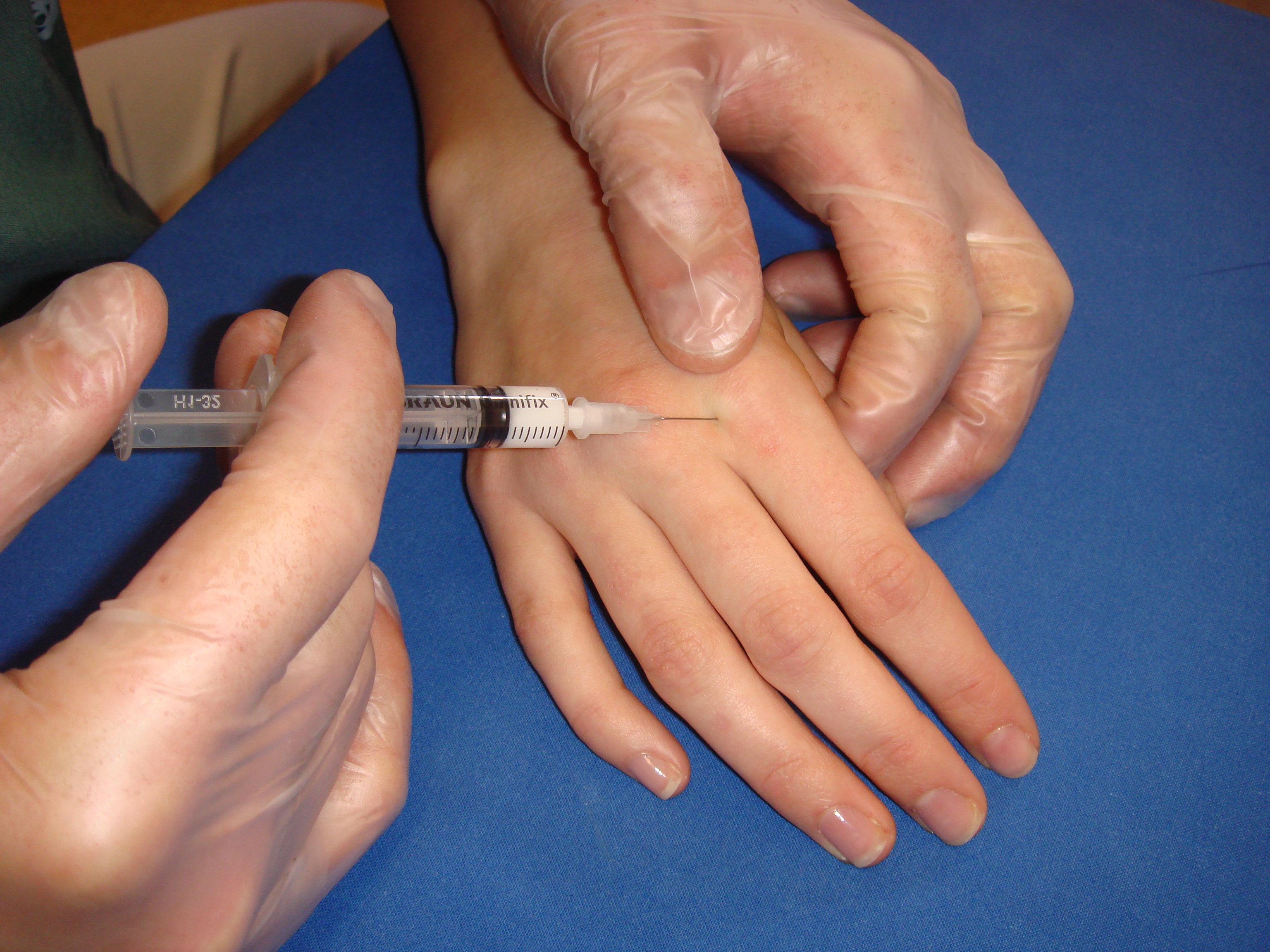 - Före punktion skall huden parallellförkjutas något för att skapa en bruten stickkanal.