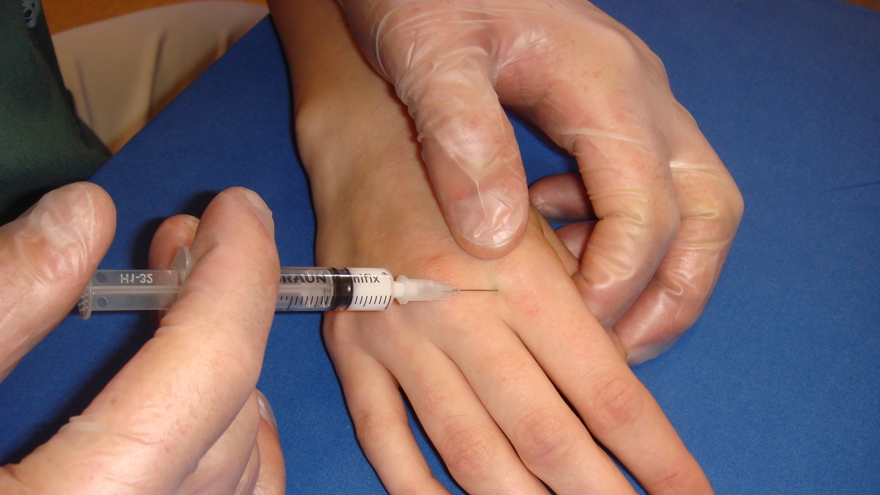 - Lokalbedövningsmedel blandat med glukokortikoidpreparat är inte nödvändigt. Det kan dock förenkla injektionen på så vis att punktionen kan genomföras under successiv injektion av vätska, på så vis får man en tydlig indikation när man bryter genom ledkapseln då motståndet minskar kraftigt.