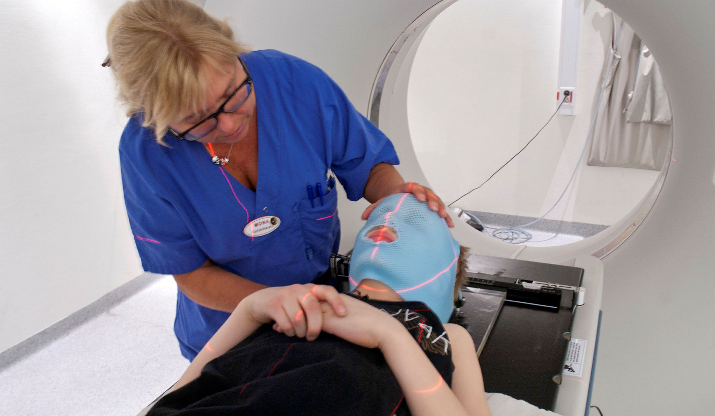 5 av 8Lotta förklarar att strålningen ska komma till exakt rätt ställe varje gång. Därför måste Austin ligga helt stilla vid behandlingen. Han får känna på en ansiktsmask som kan hjälpa till att hålla huvudet stilla.