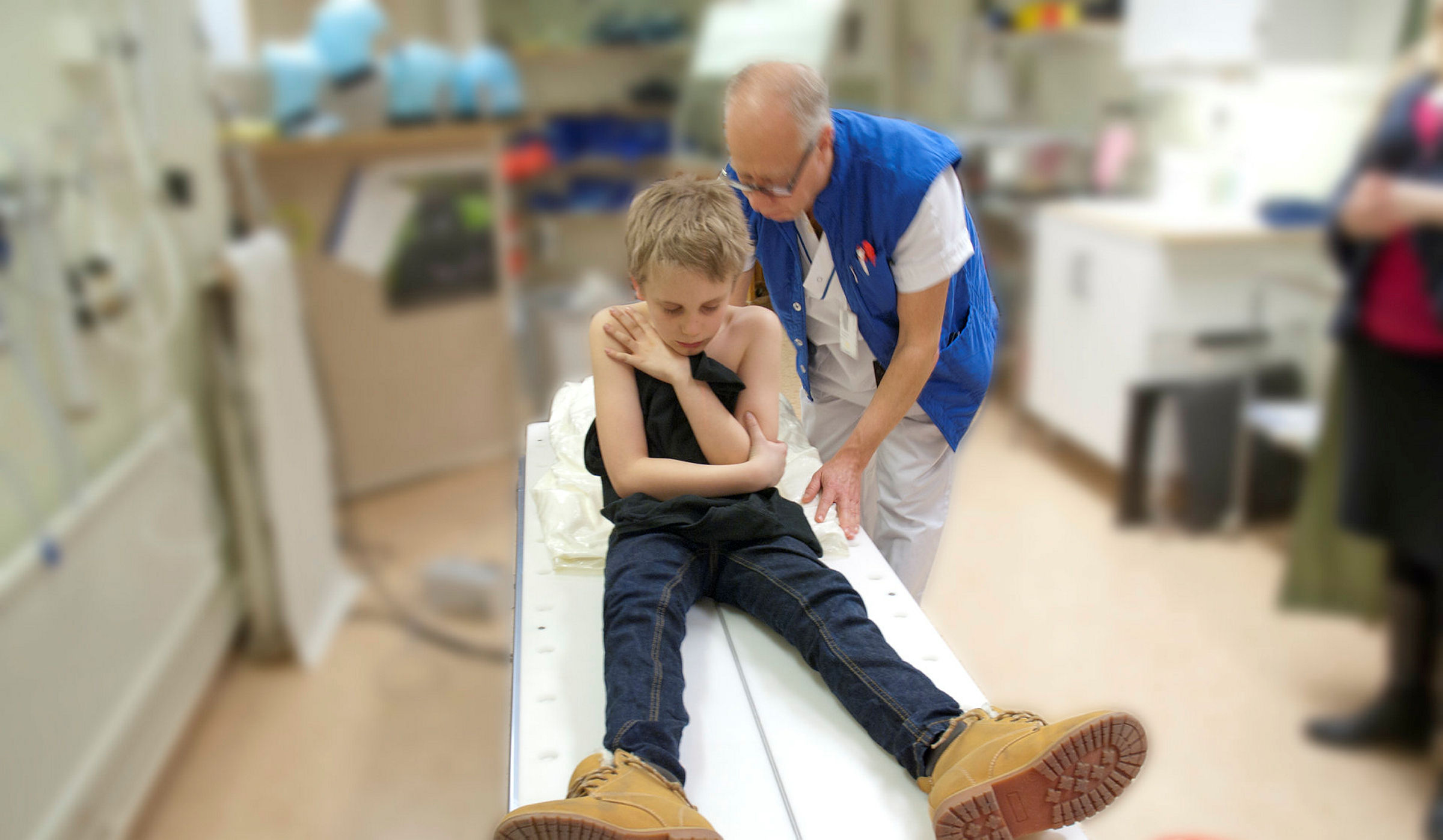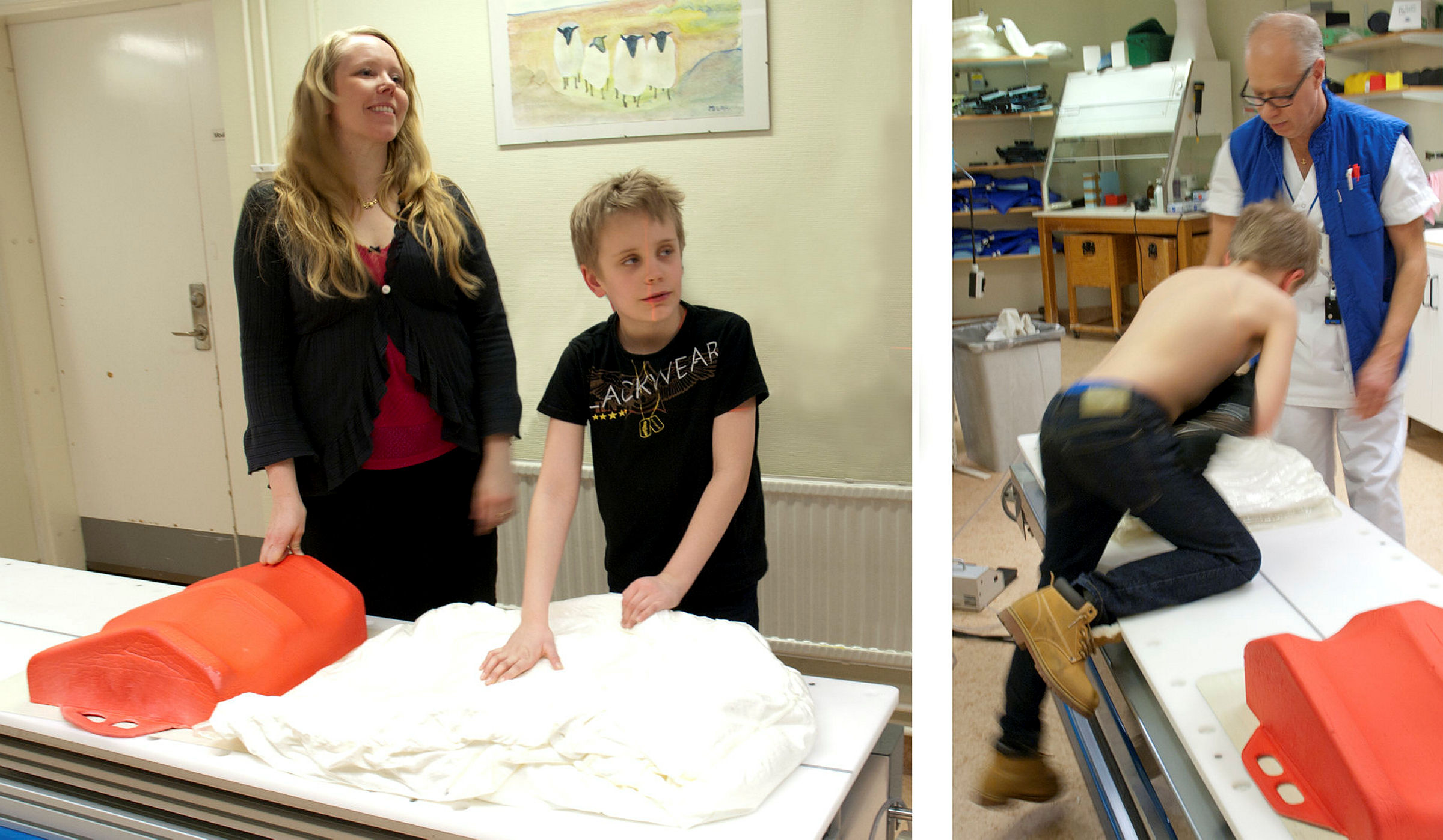 3 av 9Austin har lagt sig på undersökningssängen. Mona hjälper honom att lägga sig på rätt sätt.