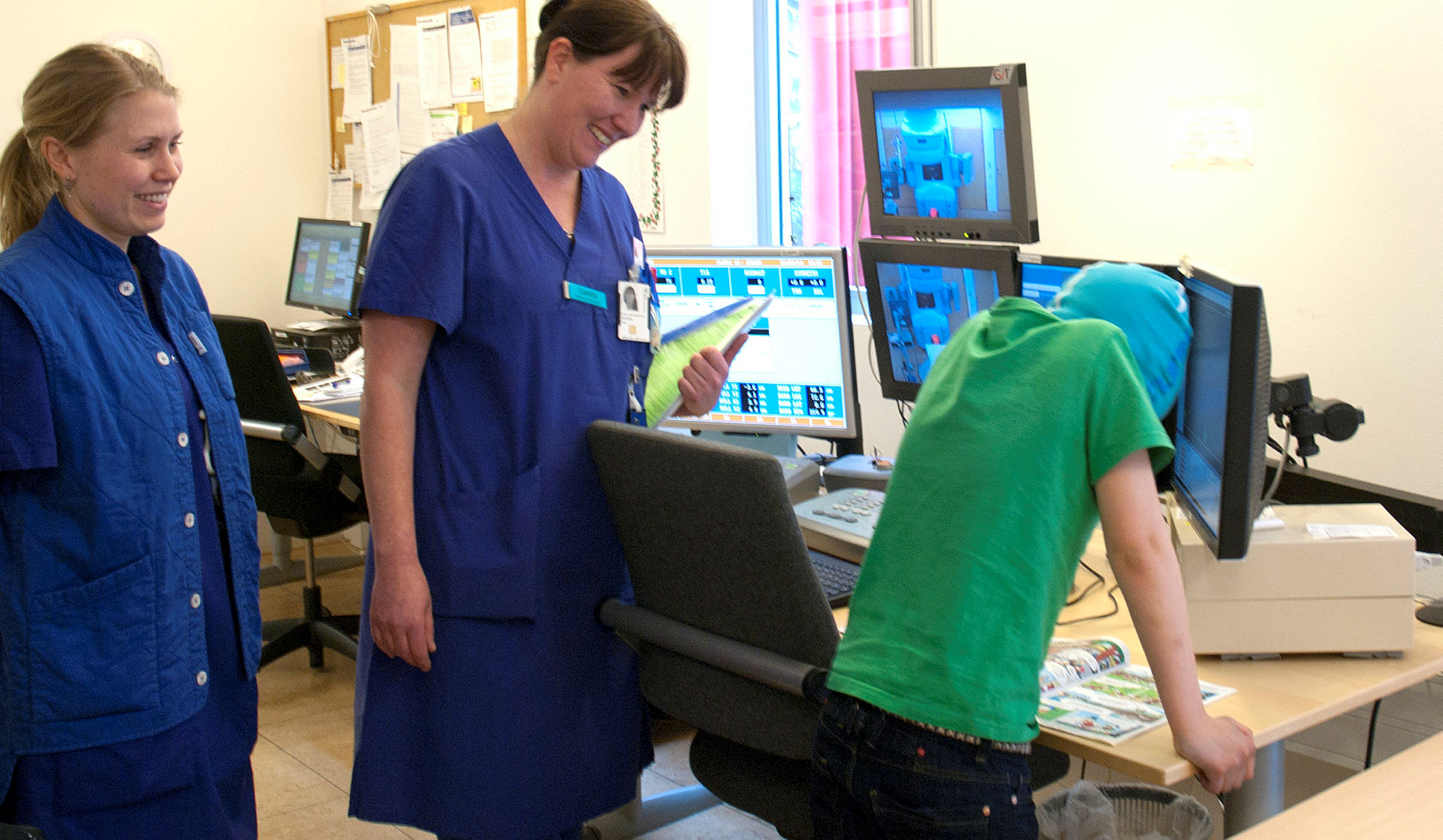 6 av 18På väg in till strålbehandlingsrummet visar Camilla och Emma hur det ser ut i manöverrummet. Austin har varit där förut och är mest intresserad av att läsa klart sin tidning.